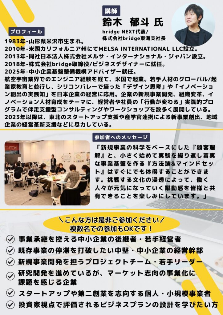 限られた経営リソースでも実現できる!発想から実践へ、組織を動かし、新規事業開発マインドを育む具体的ステップとツールを学べるセミナー&ワークショップを開催します。