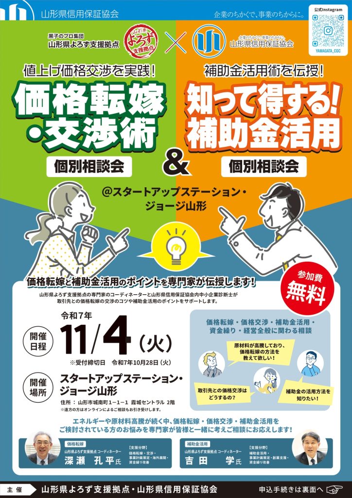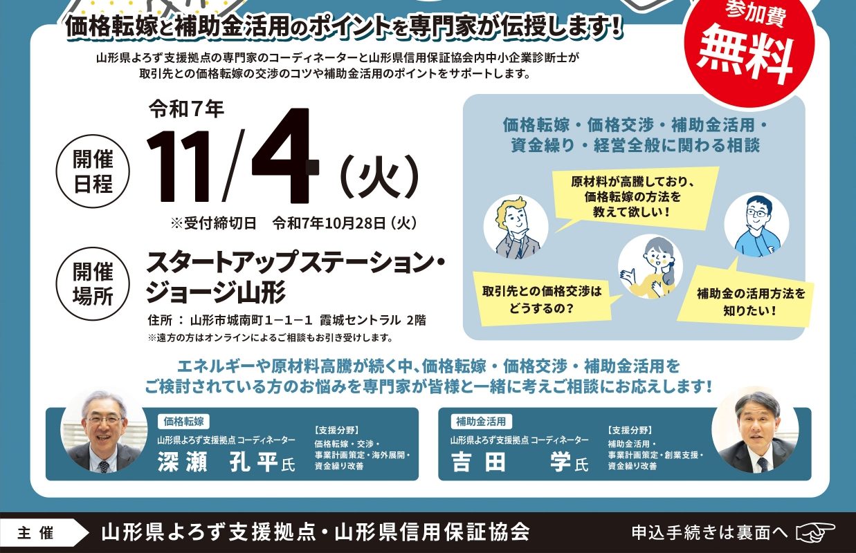 山形県信用保証協会と山形県よろず支援拠点が主催する「価格転嫁・交渉術」&「知って得する!補助金活用」の個別相談会を開催します。