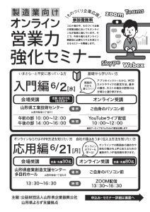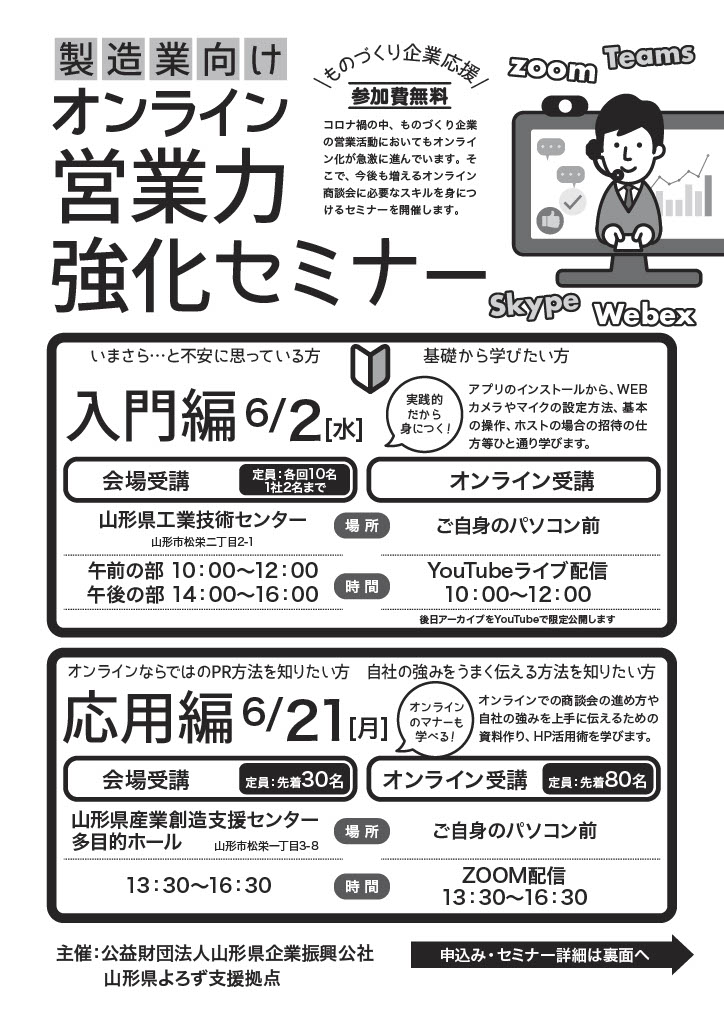 山形県企業振興公社と山形県よろず支援拠点が主催、「製造業向け オンライン営業力強化セミナー」が開催されます。