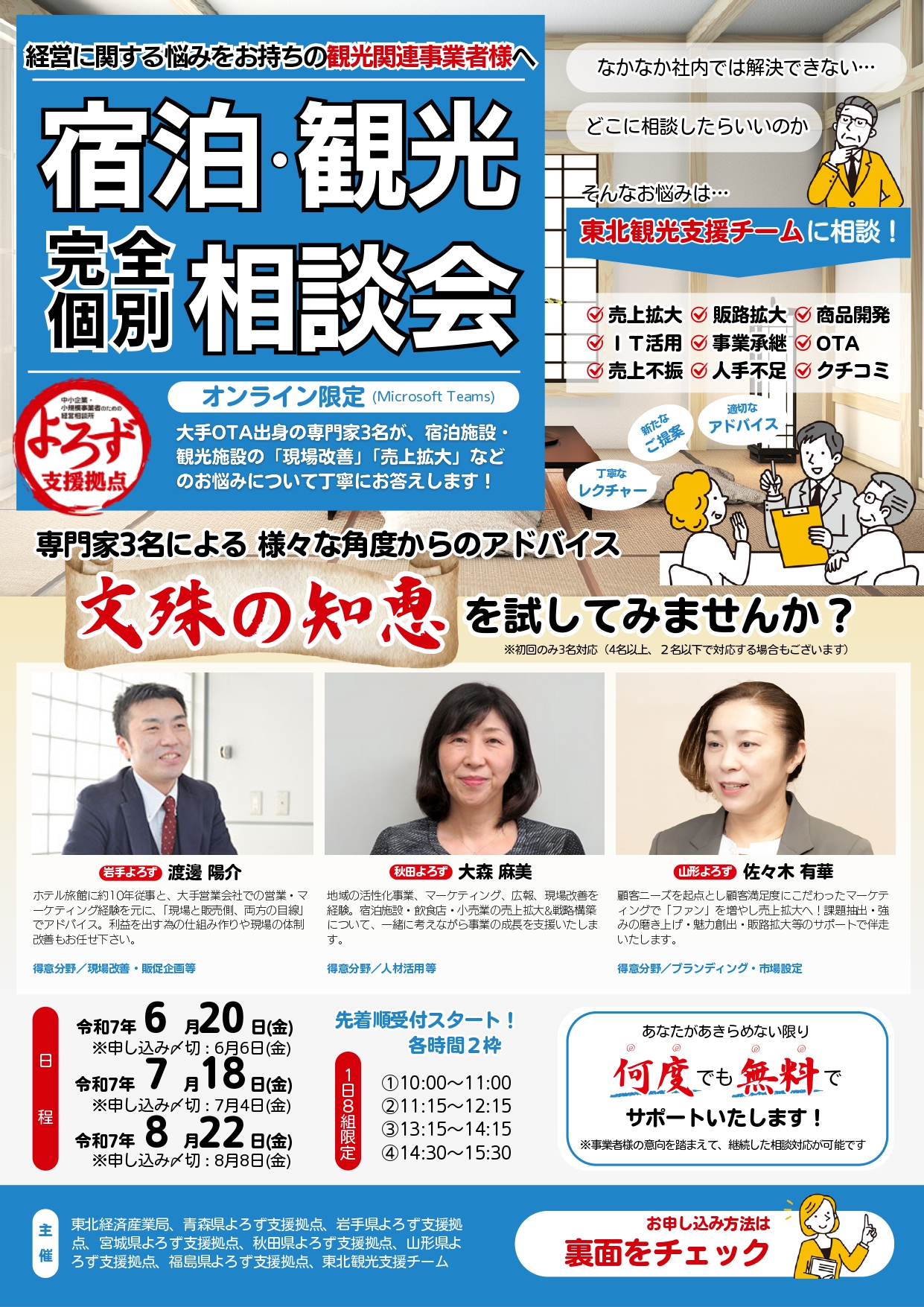 大手OTA出身の専門家3名が、宿泊施設・観光施設の「現場改善」「売上拡大」などのお悩みについて様々な角度からアドバイス。文殊の知恵を試してみませんか?