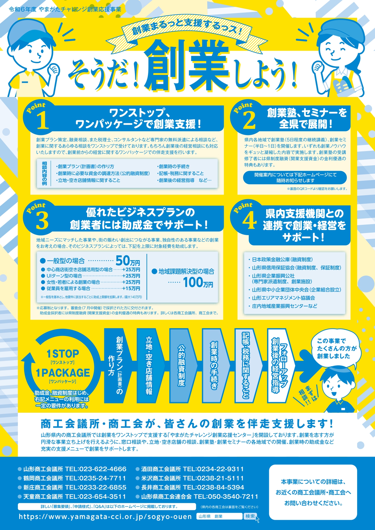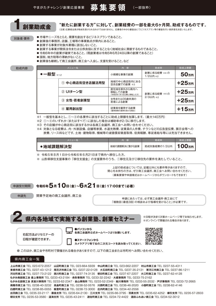 山形県内の商工会議所では、 創業をワンストップで支援する「やまがたチャレンジ創業応援センター」を開設しております。