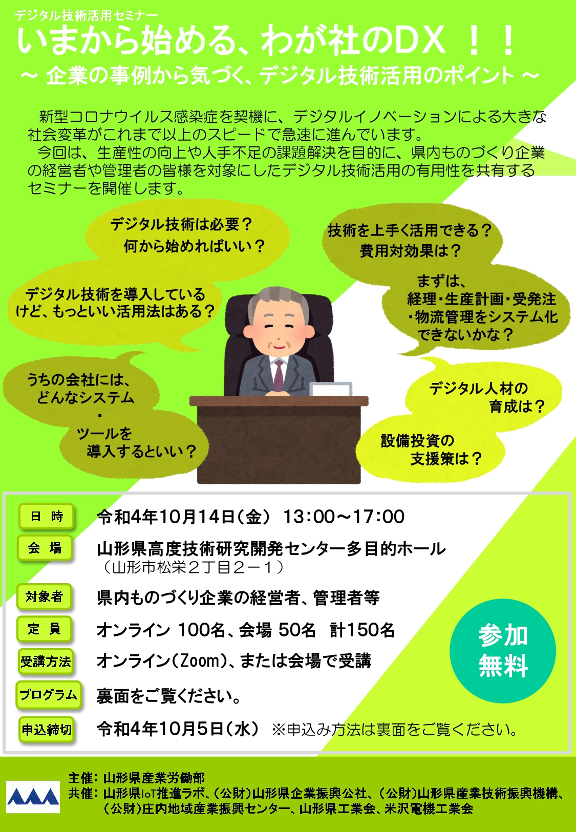 山形県産業労働部主催、山形県IoT推進ラボ、(公財)山形県企業振興公社、(公財)山形県産業技術振興機構、(公財)庄内地域産業振興センター、山形県工業会、米沢電機工業会共催によります、デジタル技術活用セミナー「いまから始める、わが社のDX!!」~企業の事例から気付く、デジタル技術活用のポイント~が開催されます。