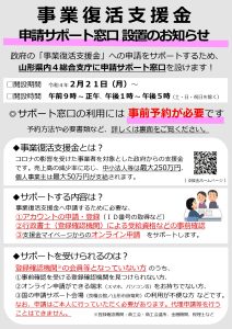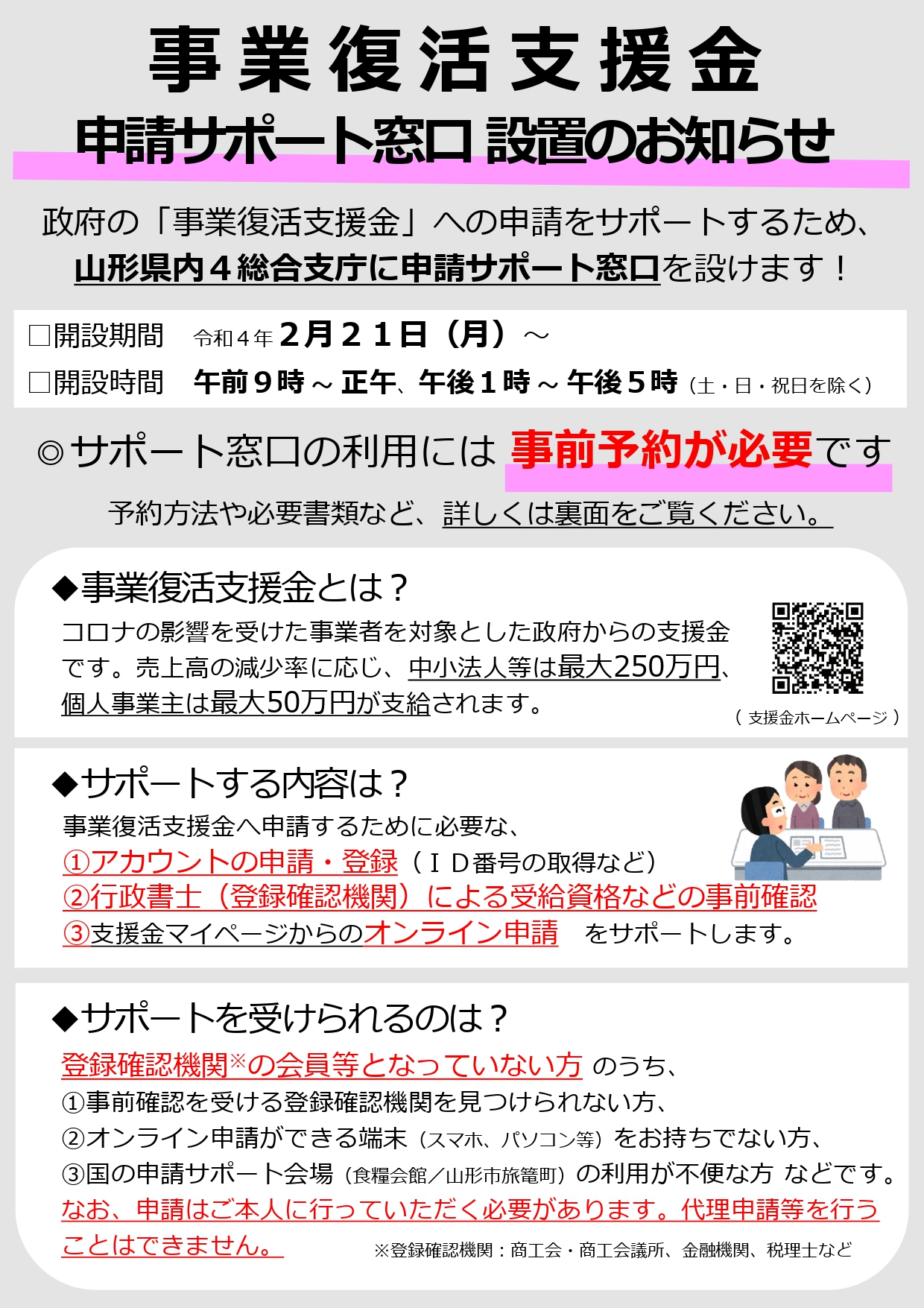 政府の「事業復活支援金」への申請をサポートするために、山形県内4総合支庁に申請サポート窓口を設置いたします。