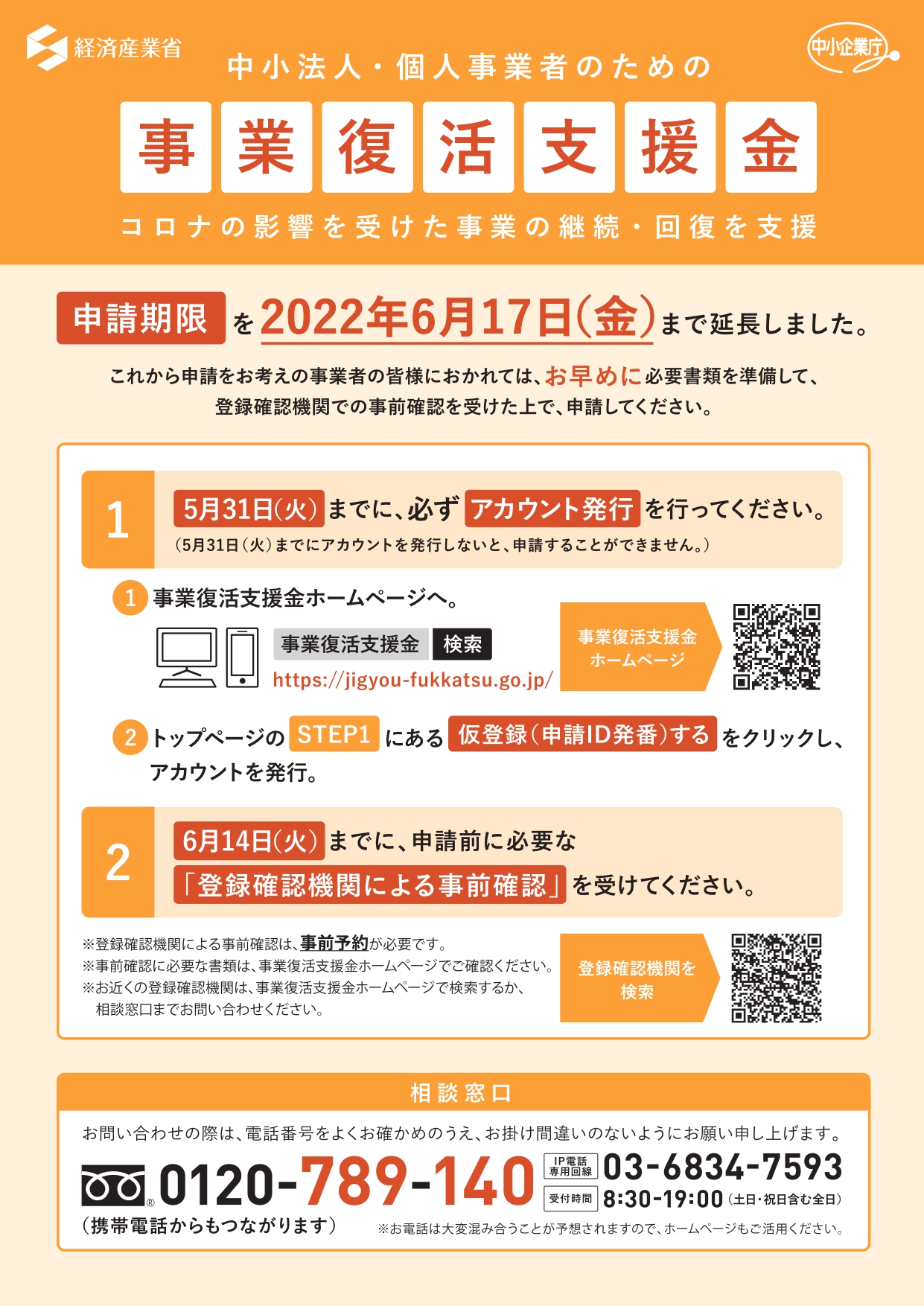 事業復活支援金の申請期限が2022年6月17日(金)まで延長されました。