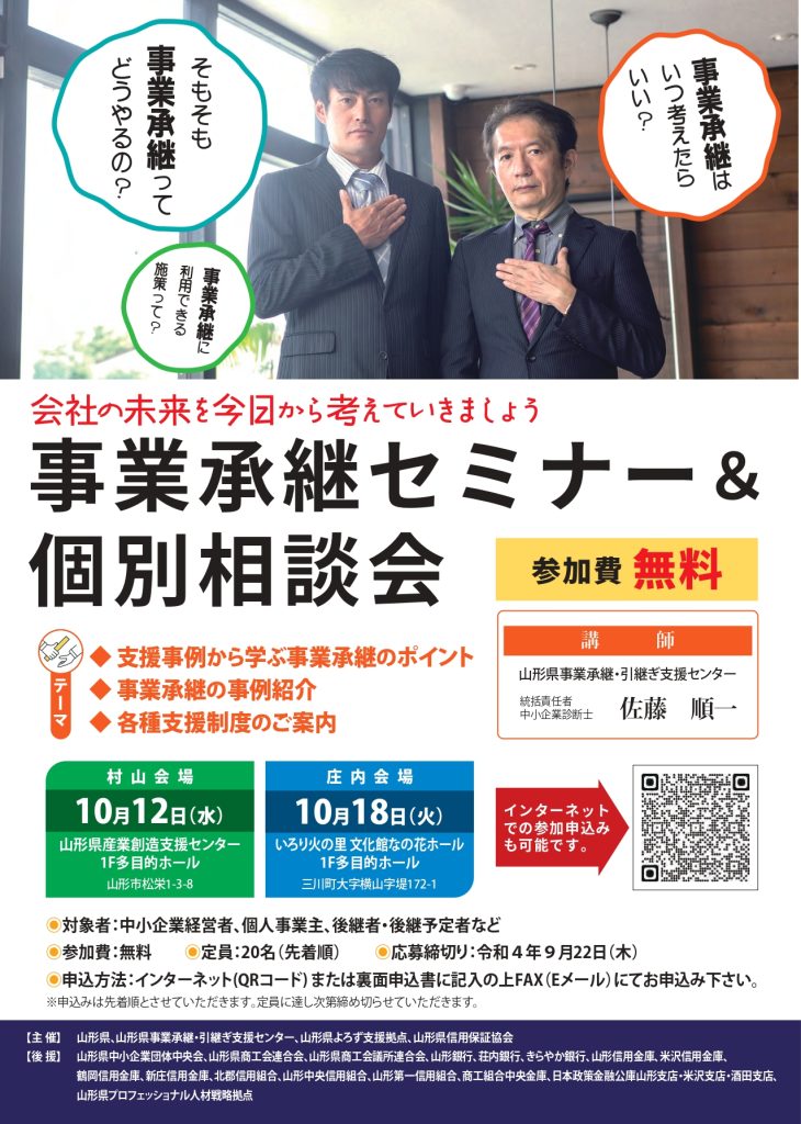 山形県、山形県事業承継・引継ぎ支援センター、山形県よろず支援拠点、山形県信用保証協会が主催する「事業承継セミナー&個別相談会」が開催されます。是非ご参加ください。
