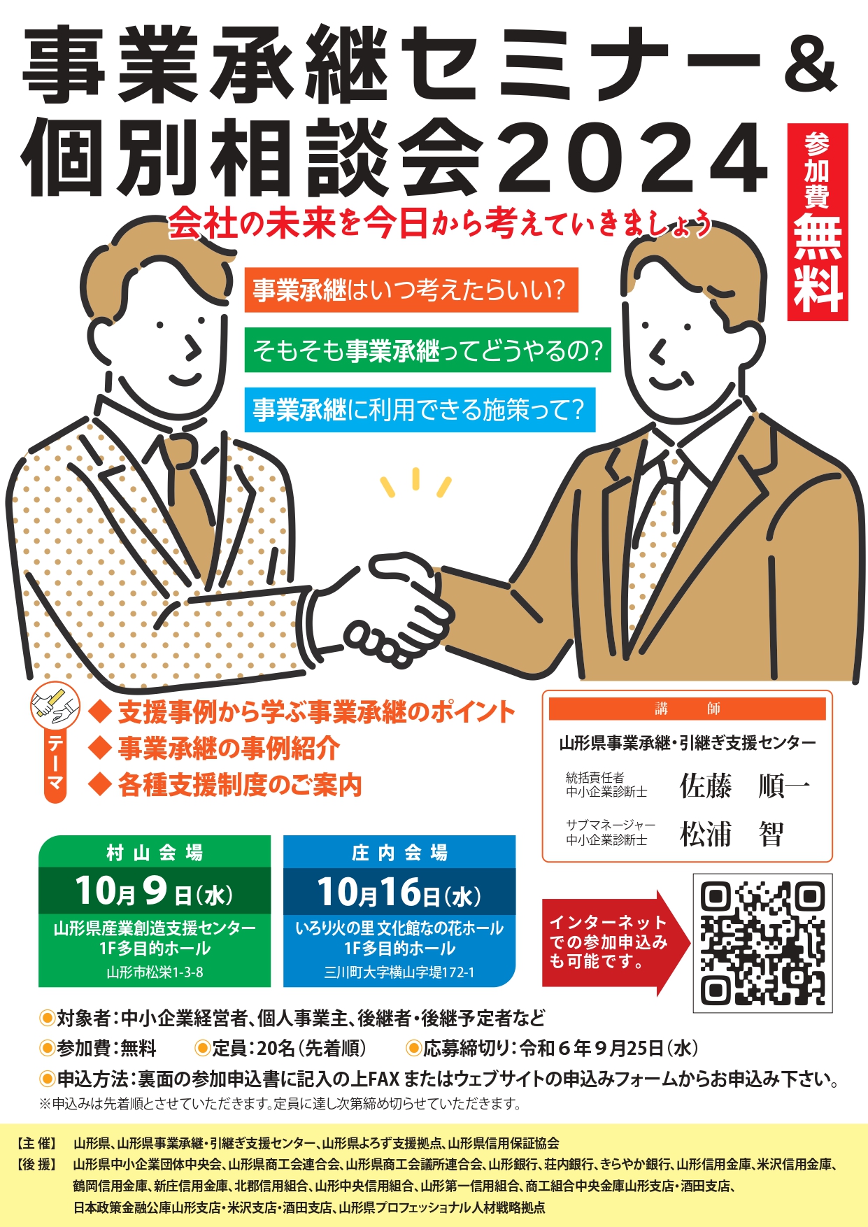 中小企業の事業承継を円滑に進めるため、山形県、山形県事業承継引継ぎ支援センター、山形県信用保証協会、山形県よろず支援拠点の「オール山形」で主催する、事業承継セミナー&個別相談会を開催いたします。