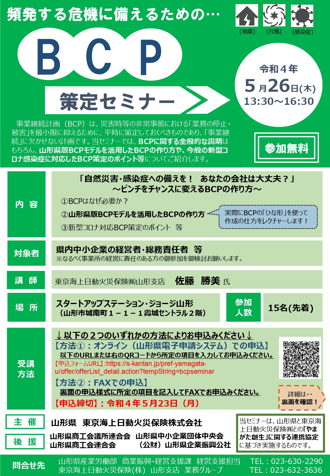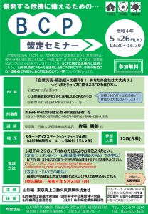 山形県と東京海上日動火災保険株式会社主催、山形県商工会議所連合会、山形県中小企業団体中央会、山形県商工会連合会、(公財)山形県企業振興公社後援による、BCP策定セミナーが開催されます。