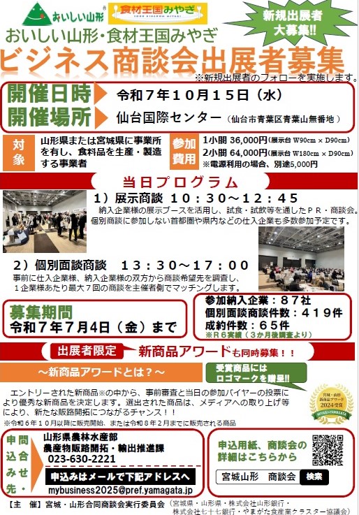 令和7年度「おいしい山形・食材王国みやぎビジネス商談会」の参加事業者(納入・仕入)の募集を開始しました。