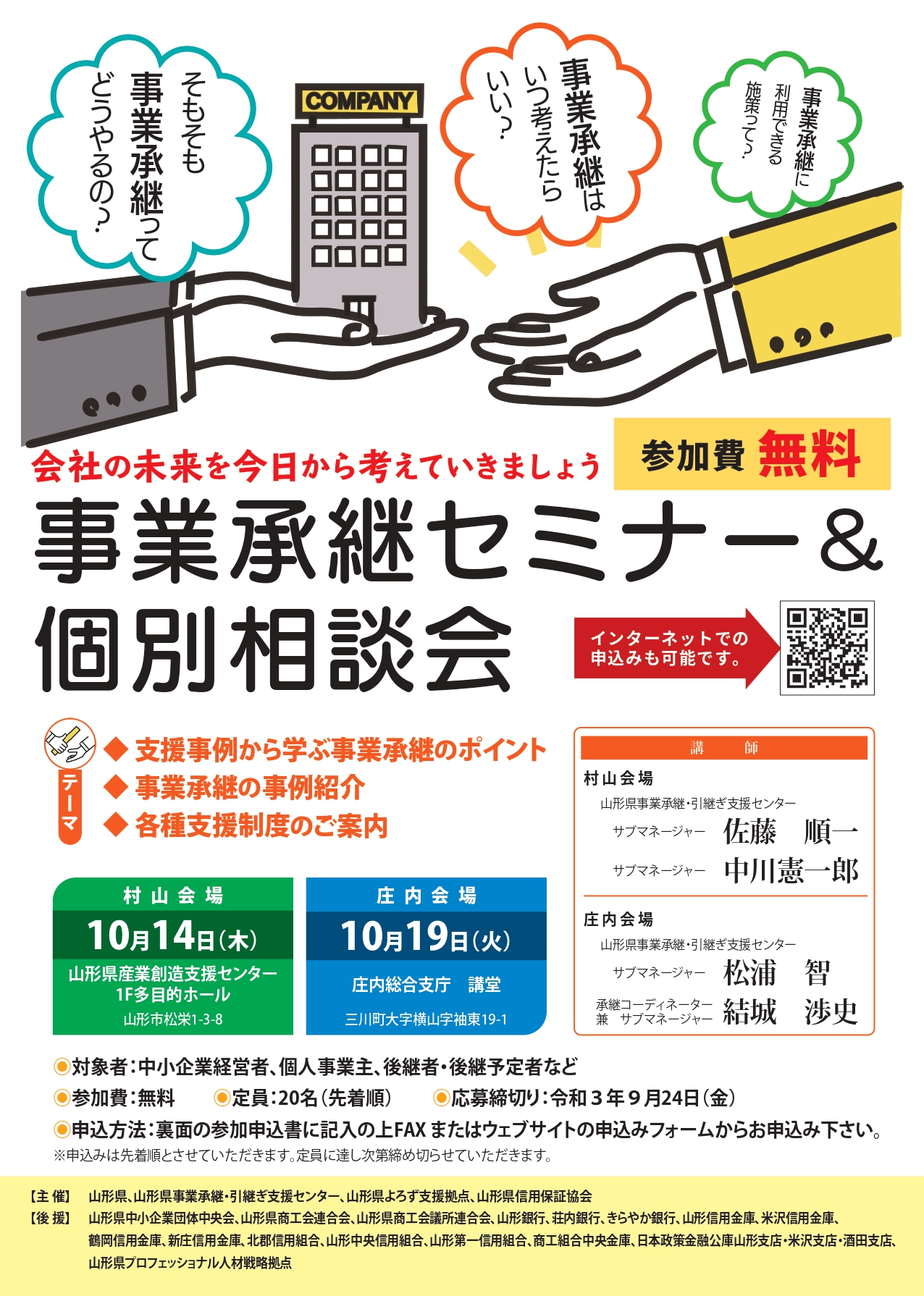 山形県、山形県事業承継・引継ぎ支援センター、山形県信用保証協会、山形県よろず支援拠点が主催いたします、「事業承継セミナー&個別相談会」が開催されます。