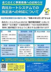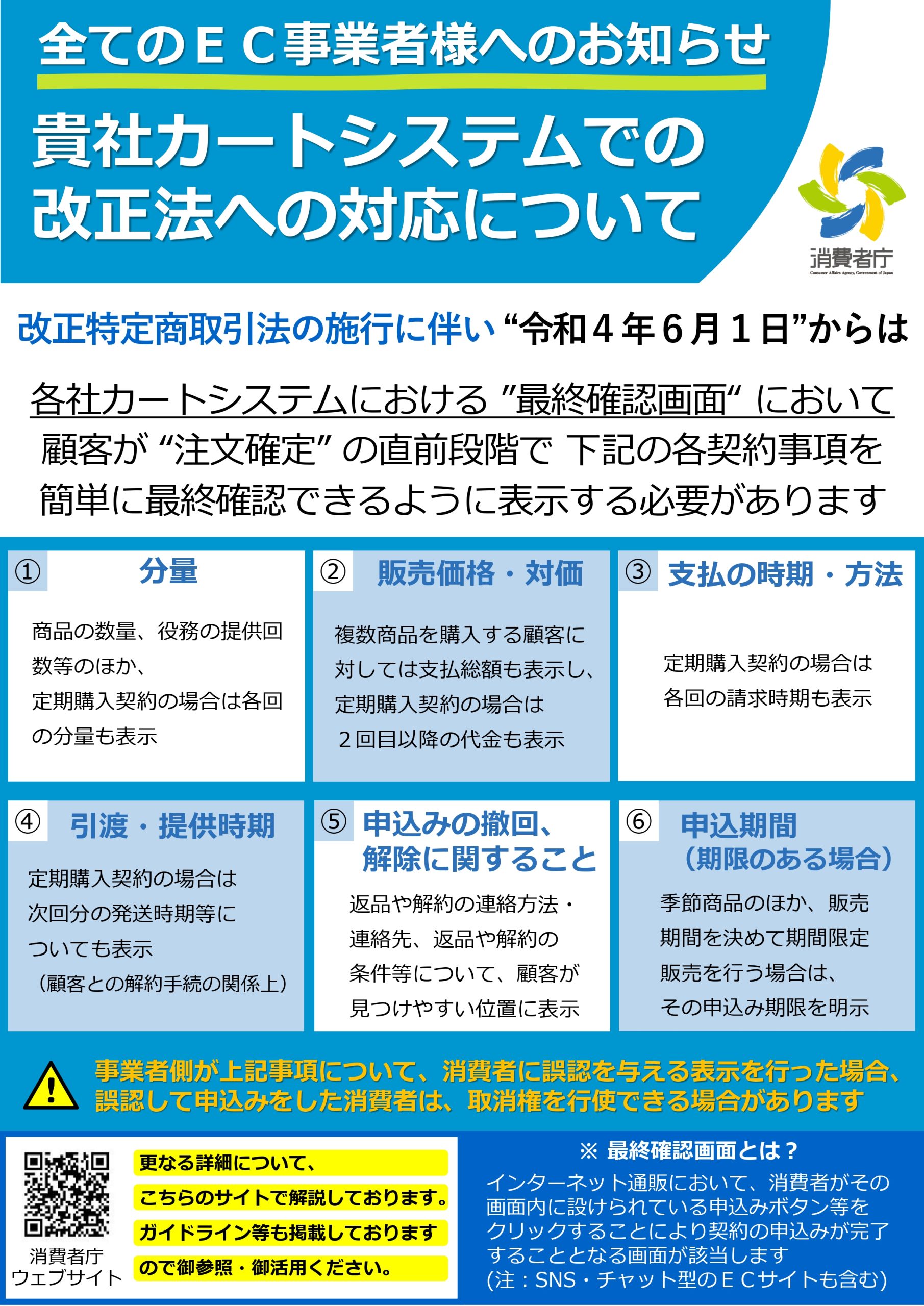 令和3年度特定商取引法・預託法などの改正により、令和4年6月1日からは各社カートシステムにおける”最終確認画面”において、顧客が”注文確定”の段階で6つの各契約事項を簡単に最終確認する必要があります。