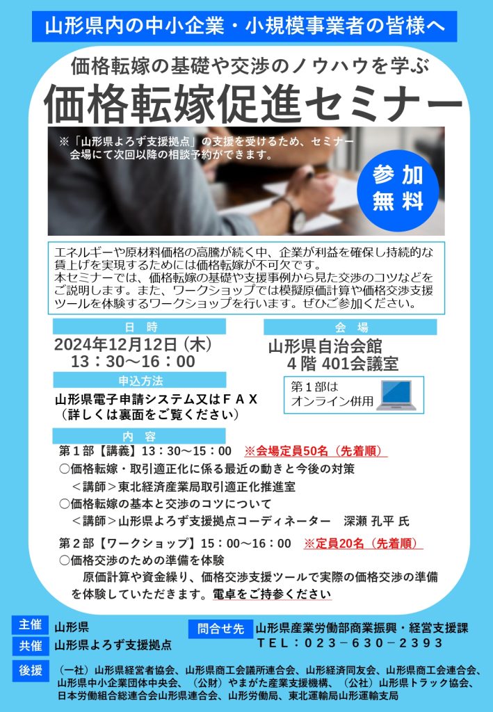 山形県主催、山形県よろず支援拠点共催の価格転嫁促進セミナーを開催いたします。