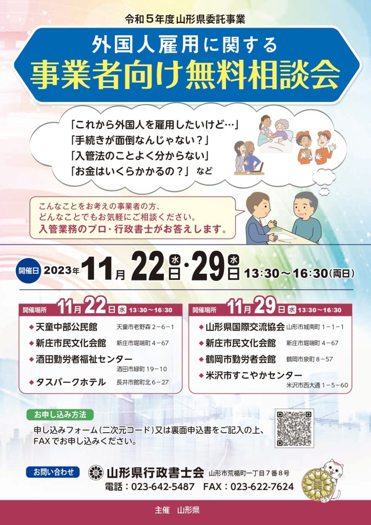 山形県行政書士会による令和5年度山形県委託事業「外国人雇用に関する事業者向け無料相談会」が県内8か所にて開催されます。