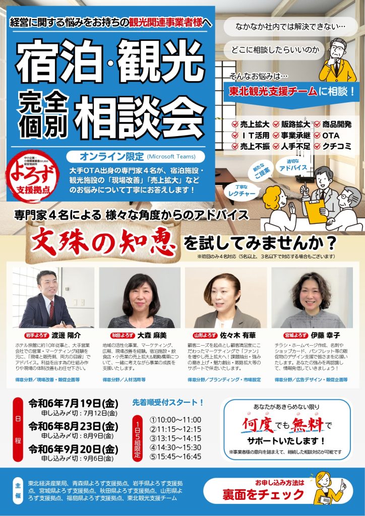 大手OTA出身の専門家4名が、宿泊施設・観光施設の「現場改善」「売上拡大」などのお悩みについて様々な角度からアドバイス。文殊の知恵を試してみませんか?