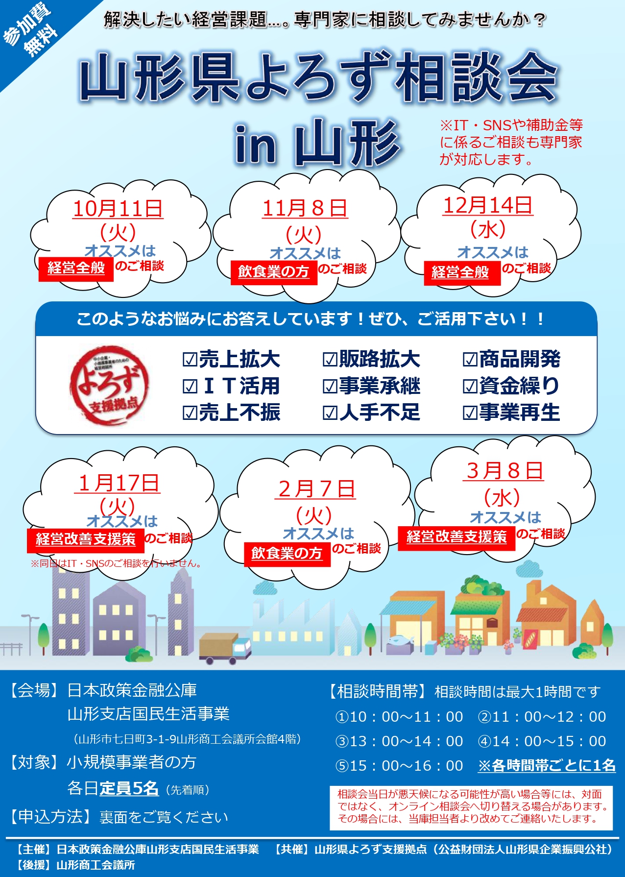 日本政策金融公庫県内各支店主催、当拠点が共催で開催しております、山形県よろず相談会のお知らせです。