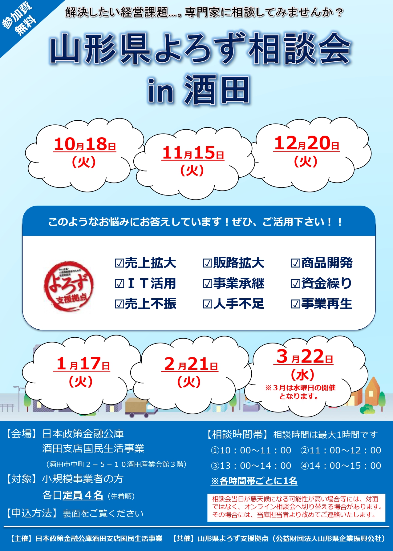 酒田支店 10/18(火)、11/15(火)、12/20(火)、1/17(火)、2/21(火)、3/22(水)