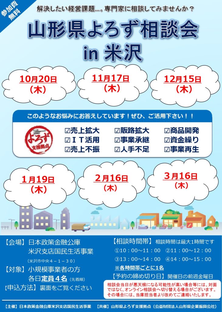 米沢支店 10/20(木)、11/17(木)、12/15(木)、1/19(木)、2/16(木)、3/16(木)