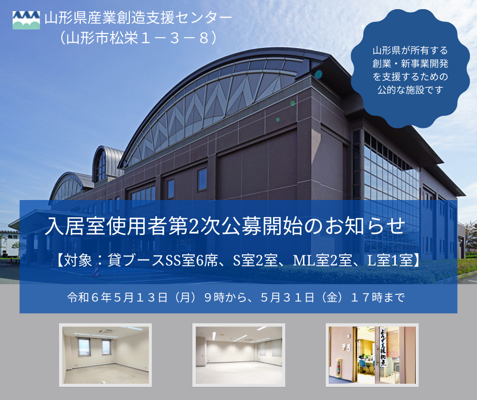 山形県よろず支援拠点の運営主体、やまがた産業支援機構が県からの委託を受けて運営する創業支援施設、産業創造支援センターでは入居室使用者の令和6年度第2次募集を開始いたしました。