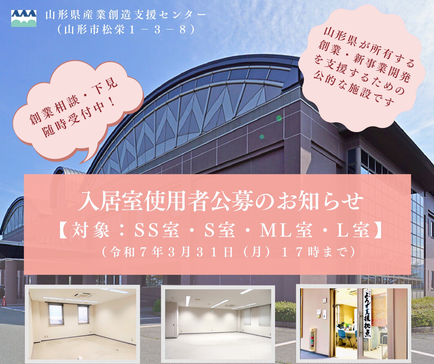 山形県よろず支援拠点の運営主体、やまがた産業支援機構が県からの委託を受けて運営する創業支援施設、産業創造支援センターでは入居室使用者の入居室使用者の募集を開始いたしました。