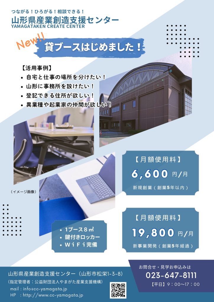 当拠点も入居しております、山形県産業創造支援センターにて、貸ブース事業が行われております。