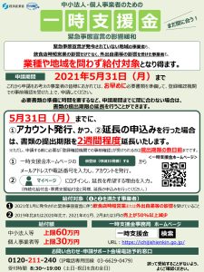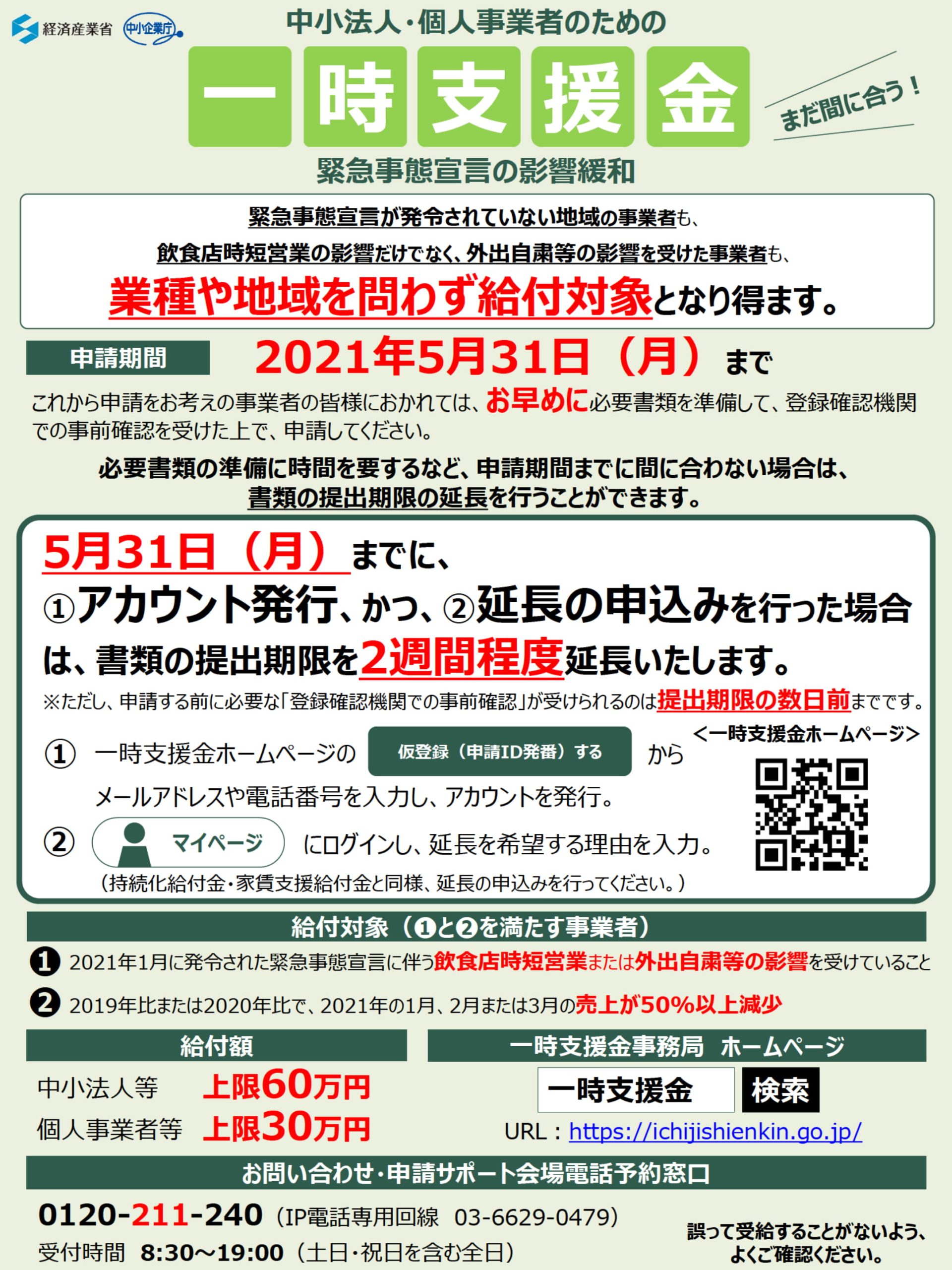 「一時支援金」は、2021年1月に発令された緊急事態宣言の影響緩和のための給付金であり、申請期限は5月31日まで(※)です。