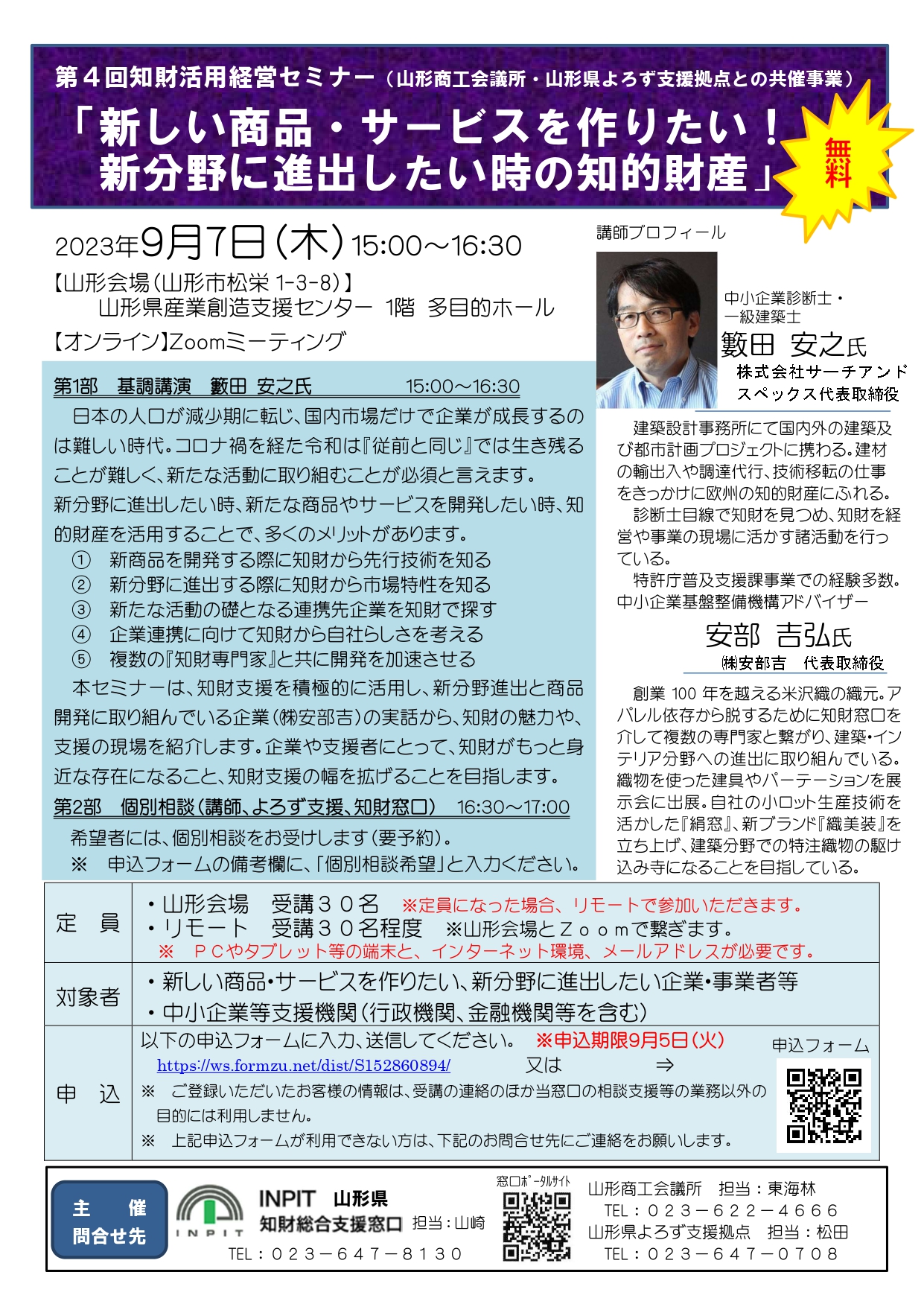 山形県知財総合支援窓口、山形商工会議所、山形県よろず支援拠点の共催事業によります、第4回知財活用経営セミナー「新しい商品・サービスを作りたい! 新分野に進出したいときの知的財産」が開催されます。是非ご参加ください。