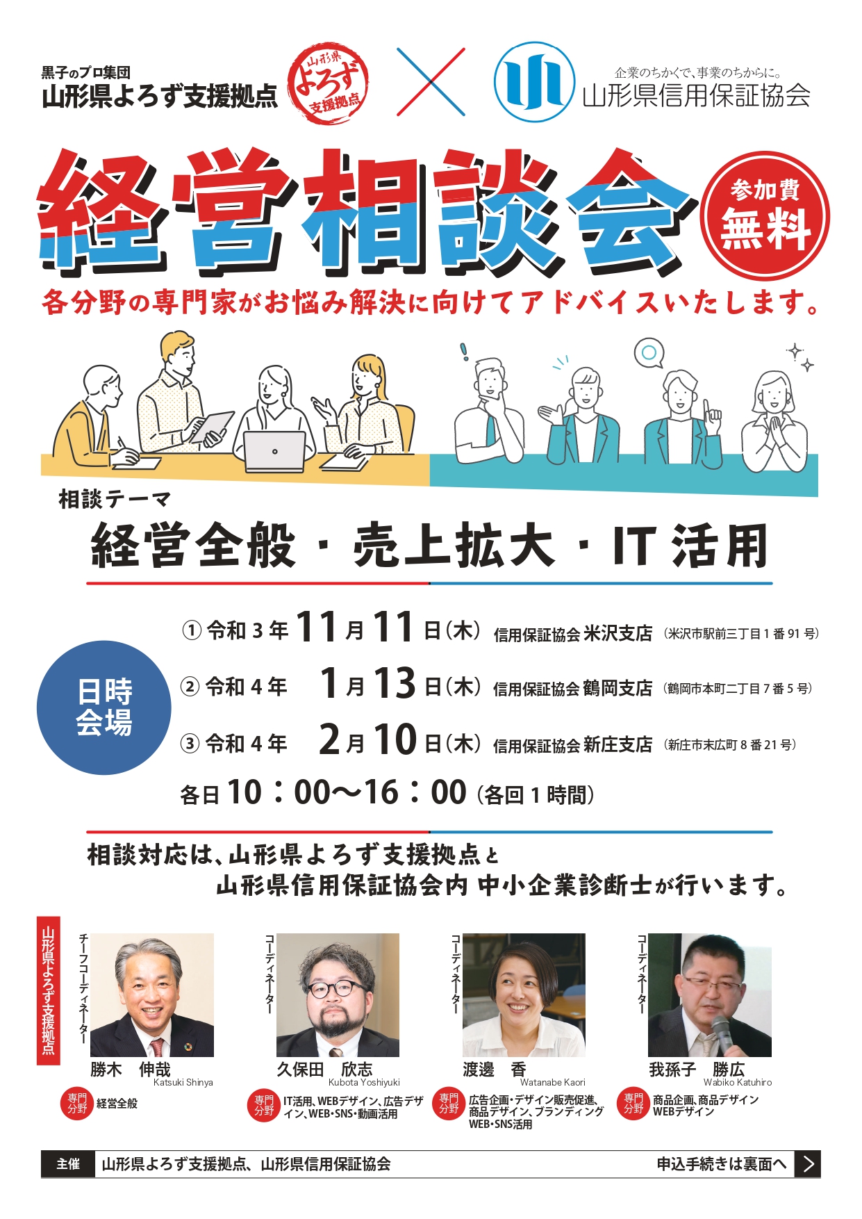 山形県信用保証協会と山形県よろず支援拠点が共催の「経営相談会」が県内3か所にて開催されます。