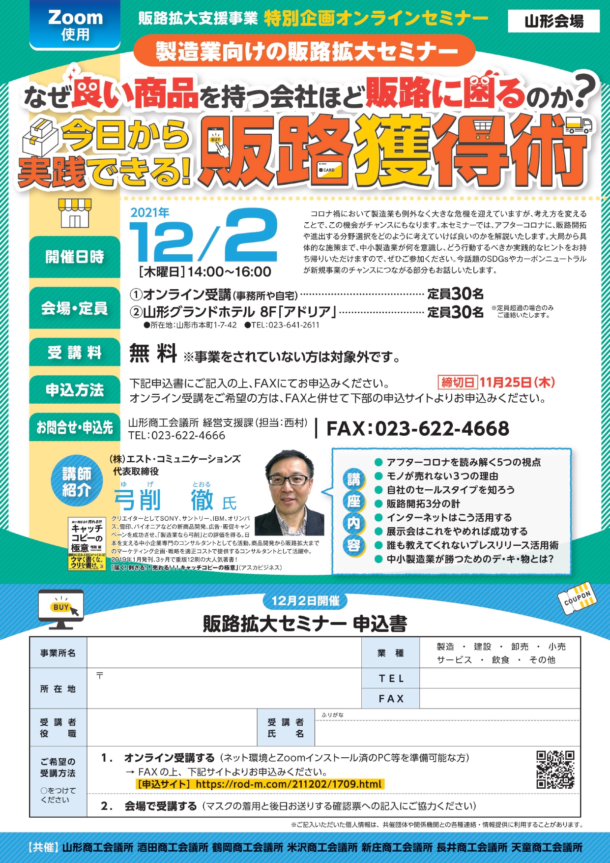 県内商工会議所共催による、製造業向けオンラインセミナー「今日から実践できる!販路獲得術」が開催されます。