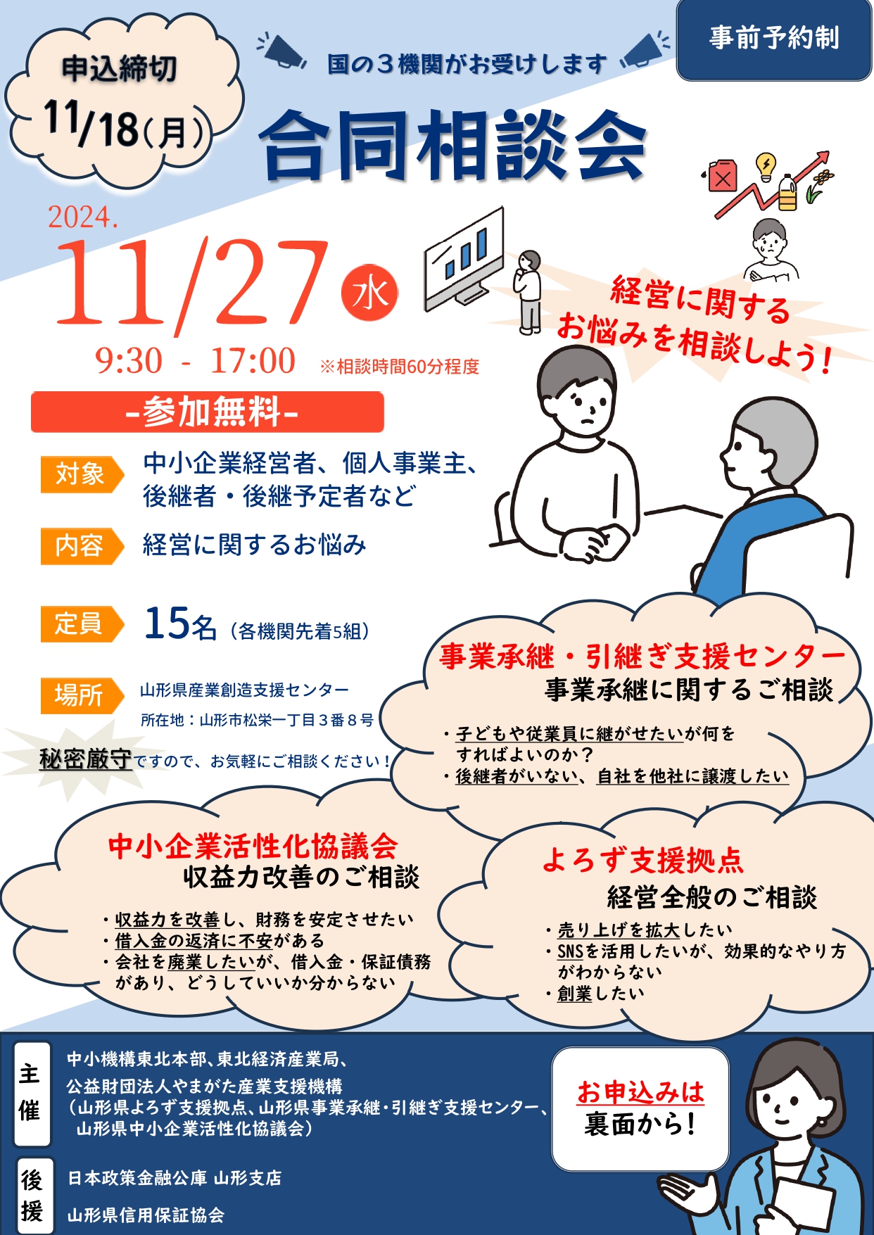 事業承継・引継ぎ支援センター、中小企業活性化協議会、よろず支援拠点による3機関合同相談会を開催いたします。経営に関するお悩みをお持ちの方は是非ご参加ください。