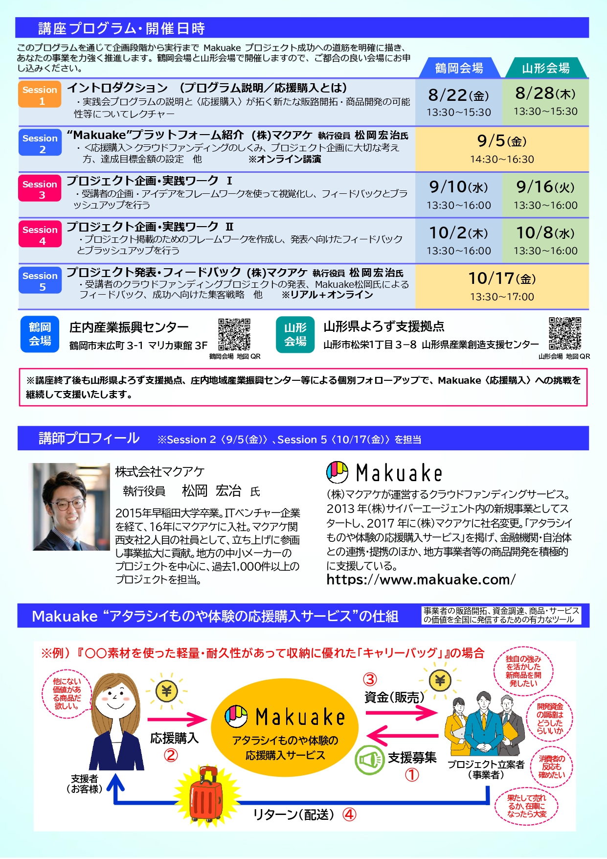 全5回のプログラムを鶴岡・山形の会場で実施します。会場により開催日の一部が異なりますのでご確認ください。