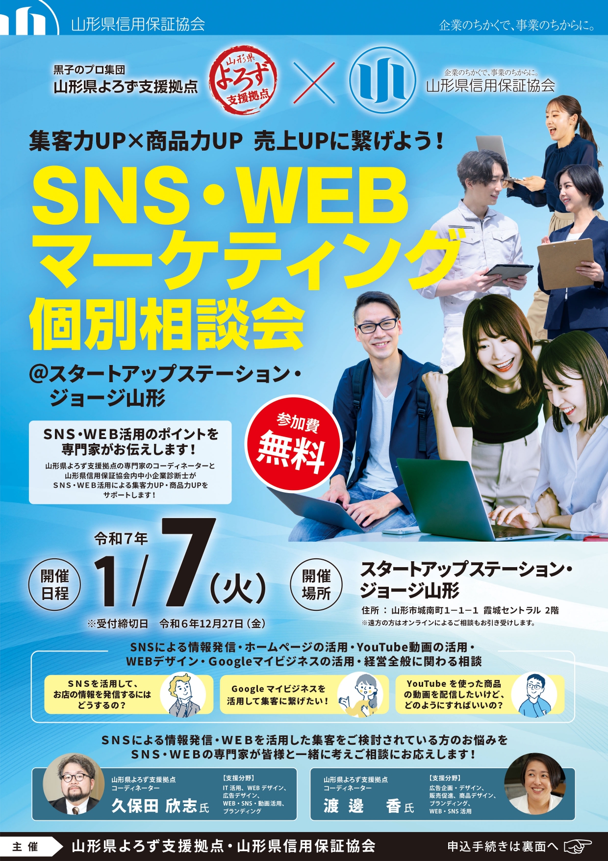 山形県信用保証協会と山形県よろず支援拠点が主催で開催する、SNS・WEBマーケティング個別相談会が開催されます。